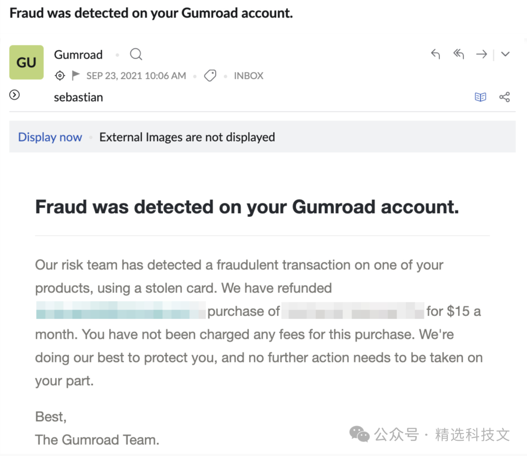 首先,骗子先生(这不是他的真名😉)要求免费使用脚本。这并不罕见——有时人们会向我发送这样的请求。当我礼貌但坚定地拒绝了他的请求后,他试图付款,但他的付款被拒绝,提示信息说他应该联系 Gumroad。再一次,这听起来不像是危险信号,更像是技术问题。最终,我收到了他支付订阅费用的确认邮件。