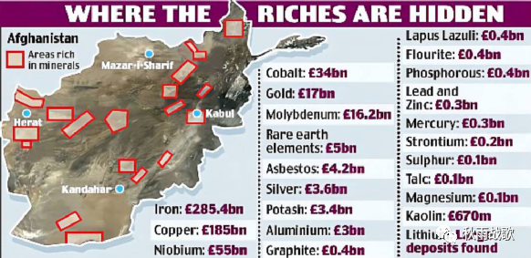 阿富汗已探明的稀有矿产储量是140亿吨,比如锂、铁、铜、钴、稀土等17种稀有贵重金属,这些是制造消费电子产品、武器装备的元素,少说估值3万亿美元以上。