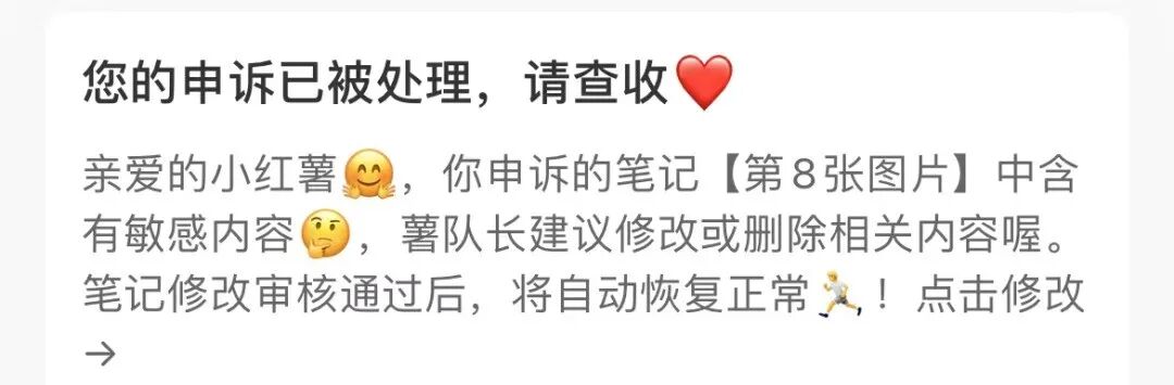如果收到的回复如下,则说明你该篇笔记确实存在敏感信息,需要修改再重新发布,或者直接删除修改再发布。