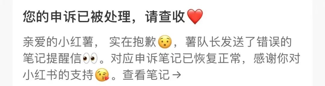 如果你收到的回复如下,则说明小红书官方把你错关小黑屋了,你的笔记是正常的,之后的流量会恢复正常。