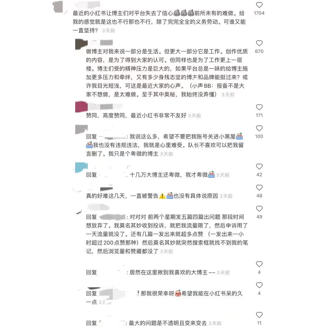前几天,被小红书的数据搞得头疼,也有很多朋友跟我抱怨小红书最近的流量真的有史以来最惨。我去看了一下官方账号的一些动静,无一例外,很多博主都在官方账号下面“反抗”,不乏大几十万粉丝的博主。