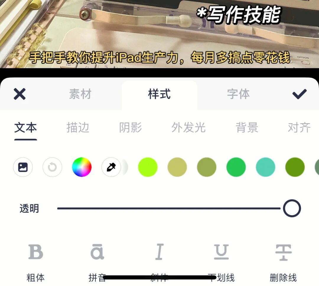 可根据自己的审美需求,调整字体颜色、字间距、行间距透明度、阴影、描边、加字体背景等功能。