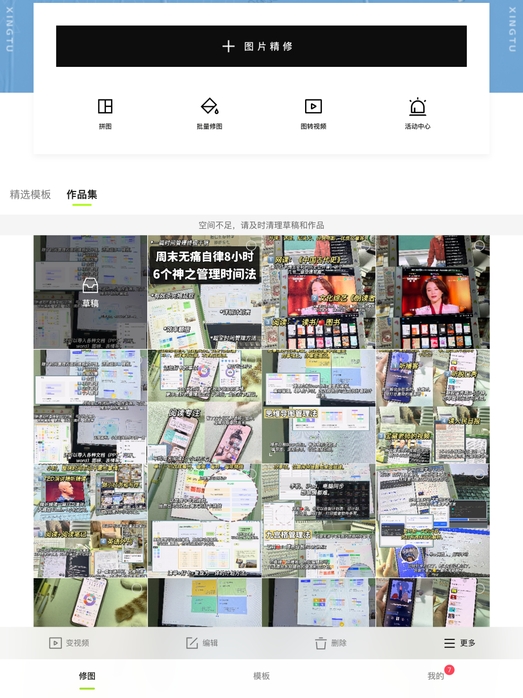 首页功能,我用的比较多的是拼图和修图软件。作品集列表,就相当于一个草稿箱,比ps方面多了,想修改的时候,直接选择修改即可,改稿的时候很方便。