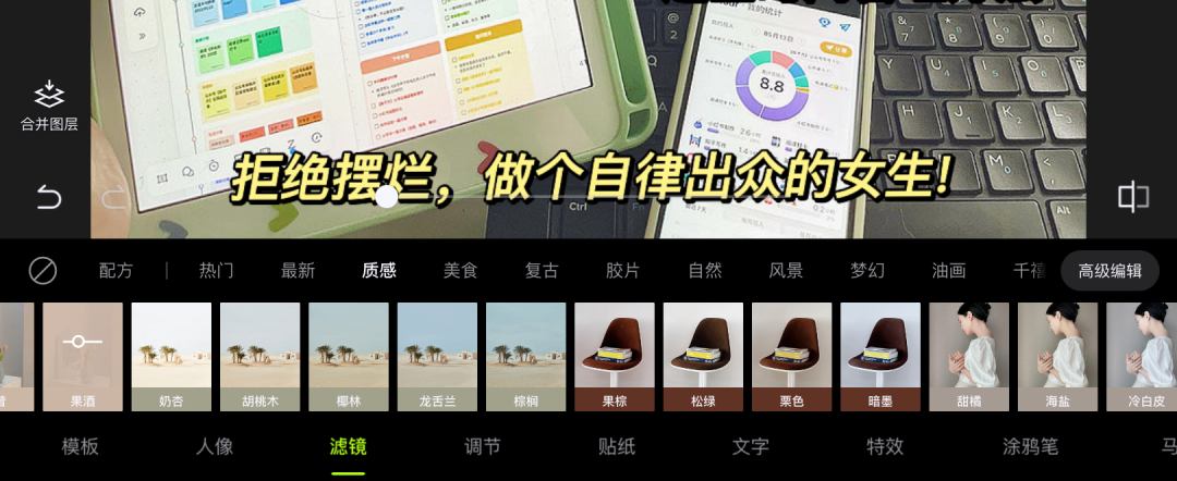其他的文字、贴纸、滤镜、调色、贴纸、背景、边框等,其实每个软件都差不多,懂了一个就基本能用懂很多个。