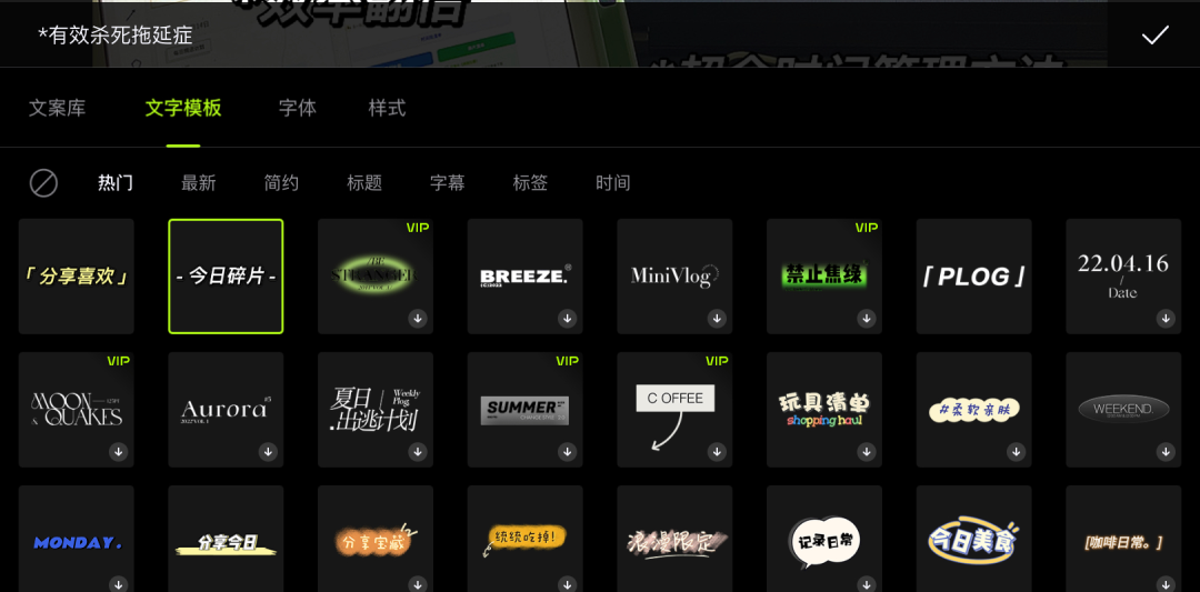 点击“贴纸”,点击添加就会出现很多的贴纸,贴纸不够用的话,直接去商店找,也有很多免费的贴纸的,包括热门、最新、免费、plog、复古风、少女心、季节等多种风格。