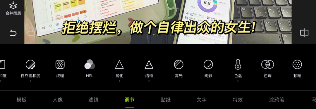 调节功能,主要是调节亮度、锐化、色温、颗粒等,让图片看起来更有质感。