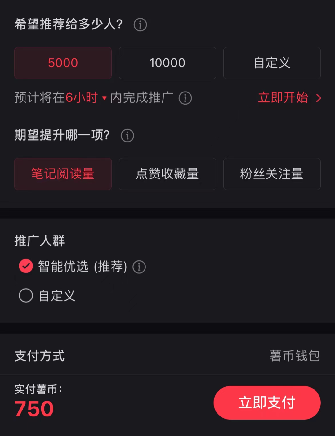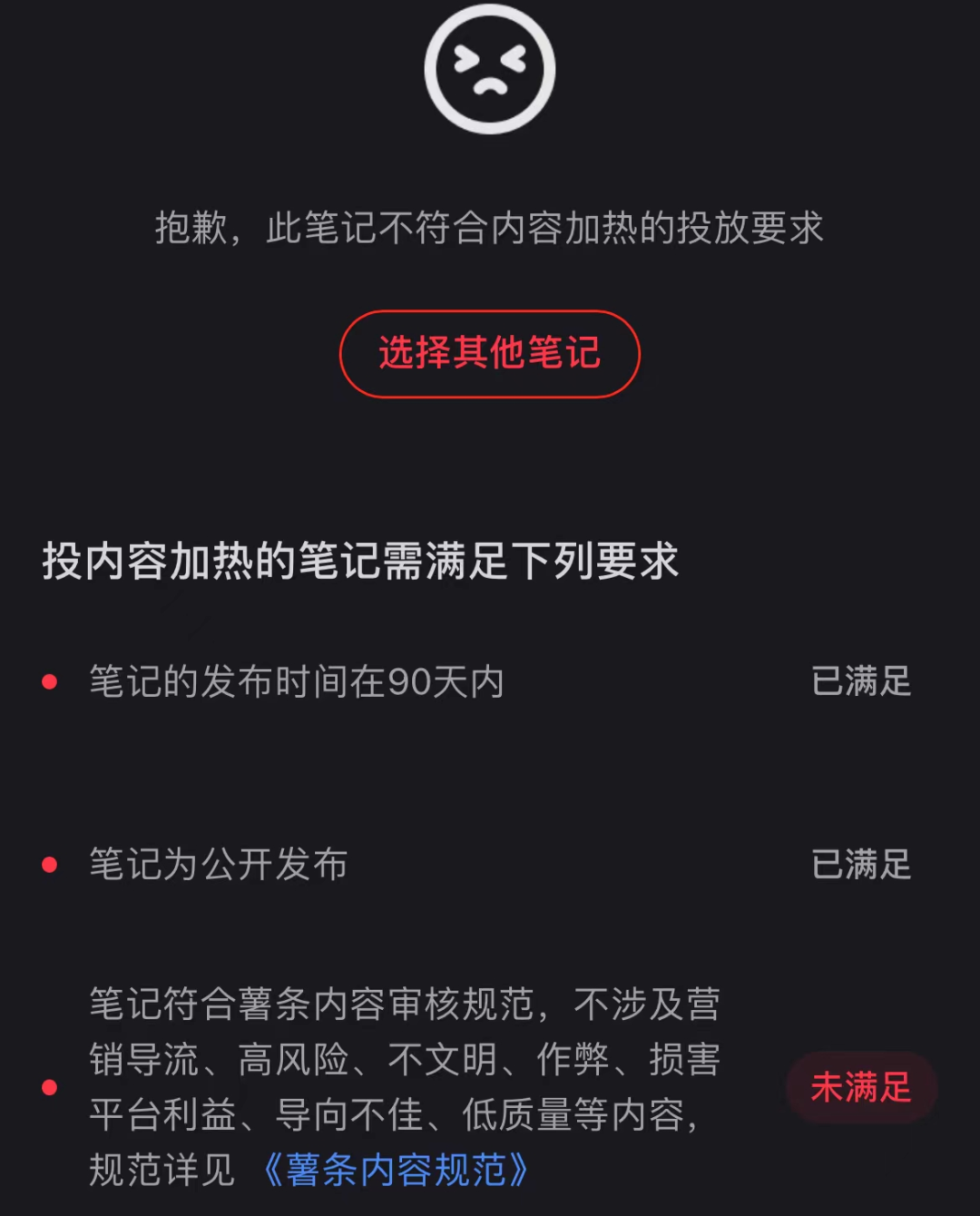 如何检测:打开你发布的笔记——点击笔记右上方的“···”——点击薯条推广,如果出现以下这个页面,那么该篇笔记就是符合要求的,没有流量,大多是内容的问题。