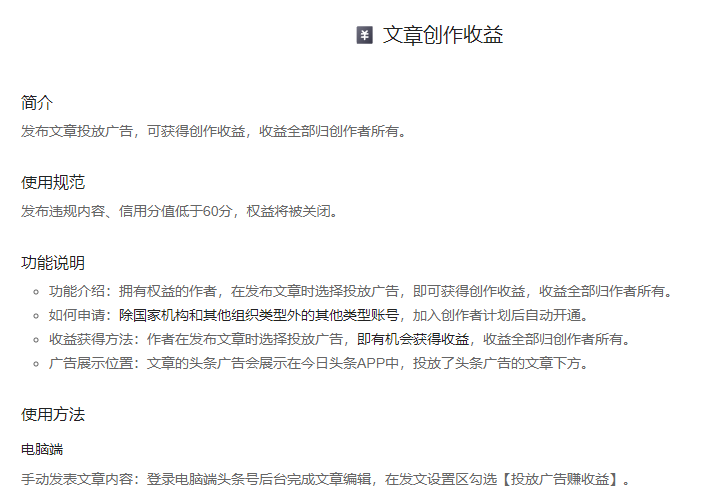 开通之后如何使用来变现?写长文章发布之时,在发文设置区勾选【投放广告赚收益】按钮,之后只要你的文章有人阅读,就会有收益,阅读越多,收益越多。