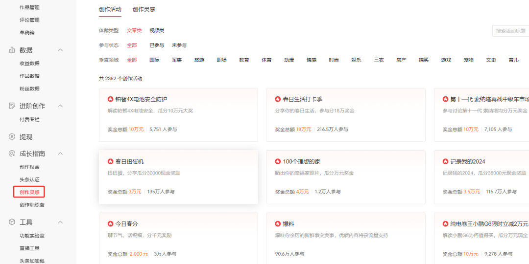 只要参加活动投稿就有可能获得收入。电脑端—头条首页—成长指南—创作灵感。手机端—创作中心—活动广场—热门活动,就可以看到有很多领域类型的投稿活动了。