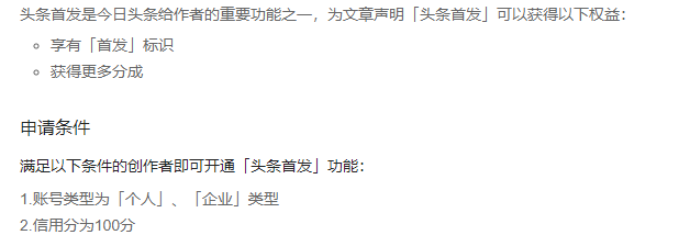 想要赚取双倍收益,还可以去申请【头条首发】功能。有一点值得注意,选了首发功能,同一文章发布72小时候才能发到其他平台。