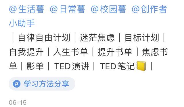 文章在开头或者结尾,踩一下热门话题,并且在文章中最好@一下官方账号,薯管家、校园薯、生活薯、小红书成长助手等。