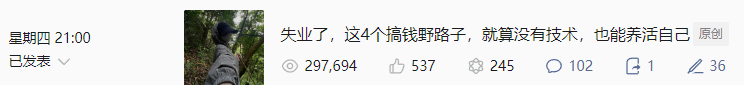 直接上图,最近的一篇10w+——失业了,这4个搞钱野路子,就算没有技术,也能养活自己。可以说是出乎我的意料了。
