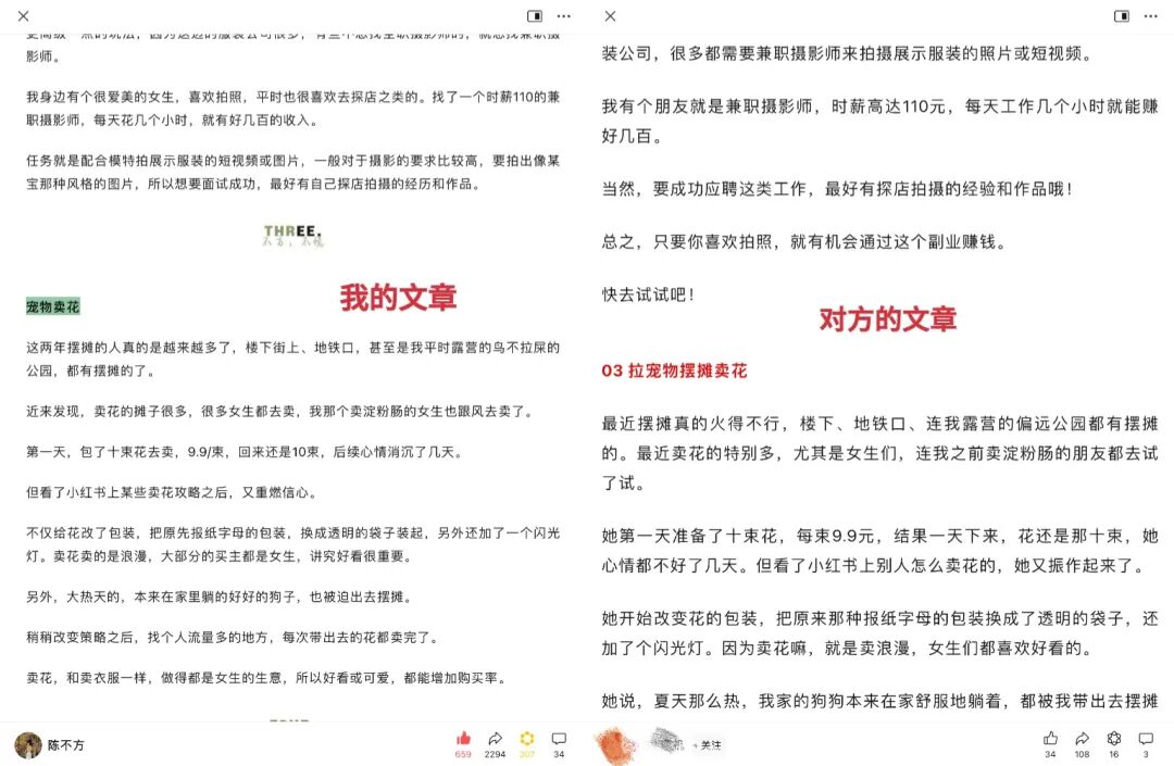 题目一样,角度一样,表述一样,甚至主观感受都一样,就改了某些字眼......自己辛辛苦苦花了一两个小时写的文章,别人三两分钟就可以拿走,然后标成自己的原创,去赚钱。