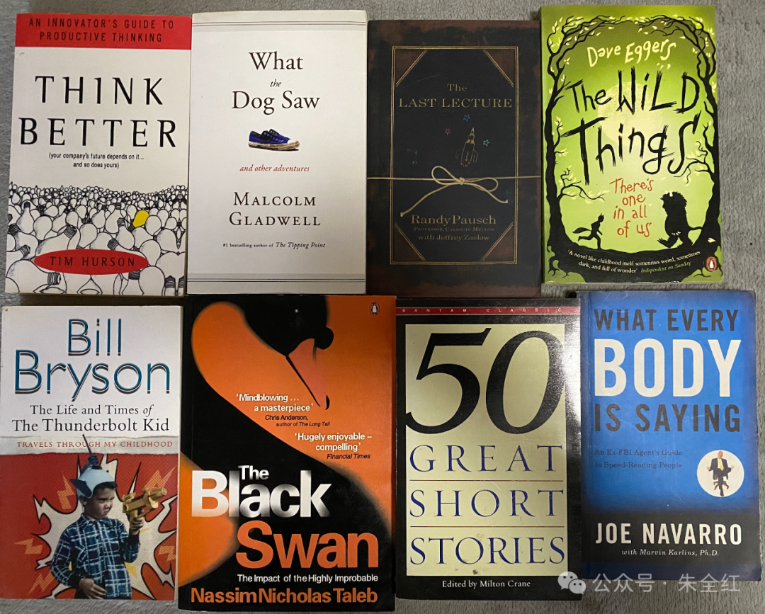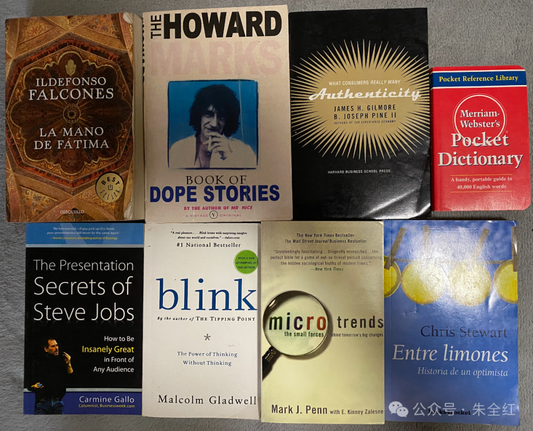 我在小区菜鸟取件处拿到的另一个包裹里有15本书,全部都是外语书籍,是来自于北京市朝阳区的朋友寄过来的。这15本书书名分别是《Merriam-Webster's Pocket Dictionary》(韦伯词典口袋书)、《50 Great short stories》(短篇小说精粹50篇)、《Think Better》(更好的思考)、《What the Dog Saw》(小狗看见了什么)、《Micro Trends:the small forces behind tomorrow's big changes》(微观趋势:当今变革背后的小驱动力)、《Entre Limones:Historia de un optimista》、《Blink》(忽视)、《The Presentation:Secrets of Steve Jobs》(非同凡“想”:乔布斯)、《What consumers really wany Authenticity》(销售指南)、《The Howard makes book of DOPE STORIES》、《Ildefonso falcones》、《Bill Bryson:The life and times of the thunderbolt kid》(危险事件)等。
