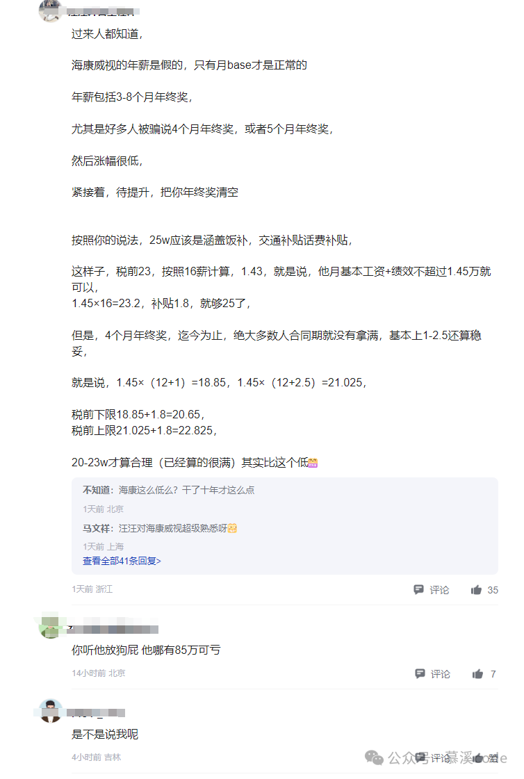 在大厂工作,不少人年薪看起来很诱人,但实际情况却不一定如表面光鲜。海康威视的员工年薪包括各种补贴和年终奖,实际到手的月薪并没有想象中那么多。正如一位网友所分析的那样,25万年薪可能只是包含了各种补贴后的总数,实际的月薪加上年终奖并没有那么高。