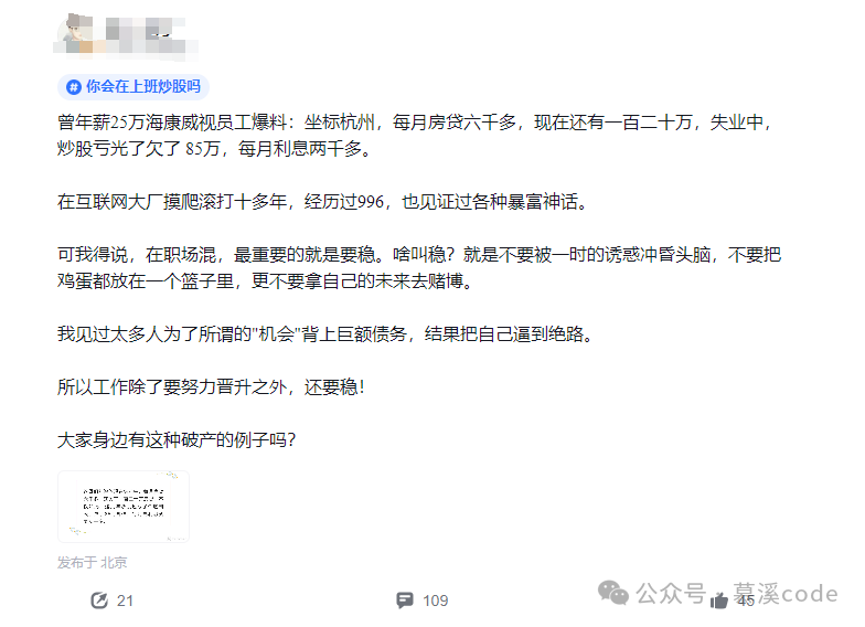 在互联网大厂摸爬滚打十多年,经历过996,也见证过各种暴富神话。可一位曾在海康威视年薪25万的员工爆料,他现在因为炒股亏光欠下85万,每月利息两千多。看得出来,在职场混,最重要的就是要稳。
