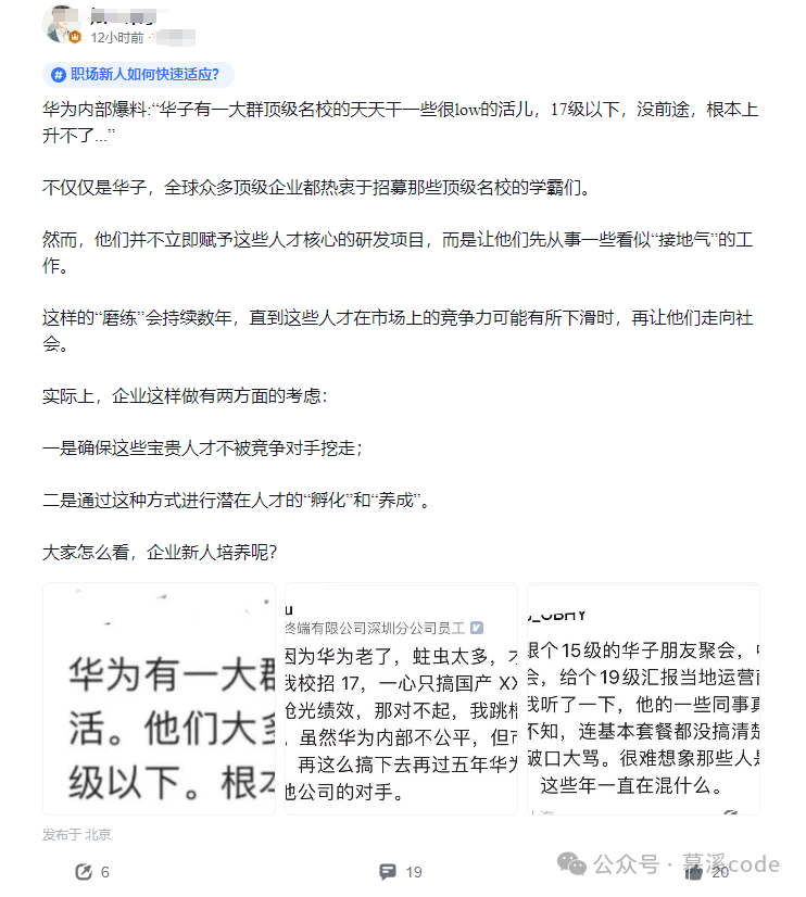 在职场,适应新环境是每个新人的必修课。最近,有网友爆料称,华为内部有一大群顶级名校的毕业生,却每天干一些很低级的活儿,根本没有前途。这事儿在职场圈子里引起了不小的轰动。大家都在讨论,顶级企业的新人培养方式到底合不合理?