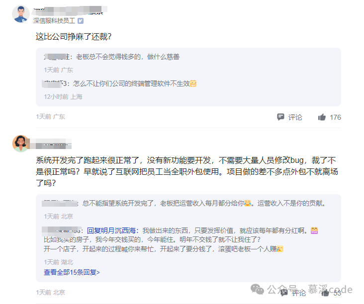 然而,另一位用户“毛里求斯586”则不认同这种看法,他反驳道:“我做出来的东西,只要发挥价值,就应该每年都有分红啊。”他用房子和店铺的例子来说明自己的观点,认为员工对公司的贡献应该长期得到回报,而不是被随意裁员。这也引发了更多用户的共鸣,大家纷纷发表自己的看法,讨论裁员是否合理以及公司对员工的长期价值认同。