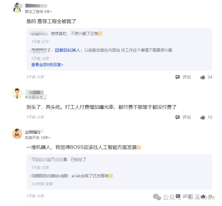 评论区中还有用户提到BOSS直聘的AI lab全员被裁的消息,令人震惊。一位名为“土桥浪子”的用户表示,BOSS直聘应该往人工智能方向发展,却得到了另一位用户“突然写BUG的小水獭”的回应:“ai lab全裁了还发展啥”。