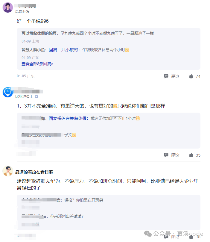 有网友建议赶紧辞职去华为,认为比亚迪已经是大企业里最轻松的了。不过,也有不少比亚迪员工表示,西安的工作强度已经算是“躺平”的了,比起深圳的要轻松得多。一位在脉脉上发言的比亚迪员工称,更可恶的是公司要求西安的员工去深圳,不去的就自离,这让人非常无奈。