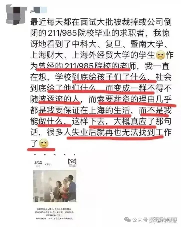 前阵子,某职场社交平台上,有位曾经在211、985高校任教的HR吐槽说,最近面试了一大批被裁员或公司倒闭的高学历求职者,让她惊讶的是,这些中科大、复旦、暨南大学、上海财大的毕业生们,现在求职的理由变成了“要保证在上海的生活”,而不是展示自己的能力。这个话题迅速引起了网友们的热议。