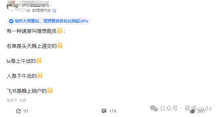 还有网友调侃说,理想汽车这是在“优化人员结构”,毕竟,裁掉一些“老员工”,才能给那些“新鲜血液”腾出位置嘛。