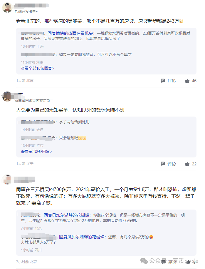 帖子一出,评论区瞬间炸开了锅。有网友现身说法,表示在北京,几百万的房贷比比皆是,243万起步那都是常态,听得人膝盖一软,直呼“打扰了”。还有网友吐槽,说自己同事在三元桥买了套700多万的房子,每个月房贷1.8万,简直是“想死都不敢死”,这哪是买了房子,分明是给自己套了个金手铐啊!