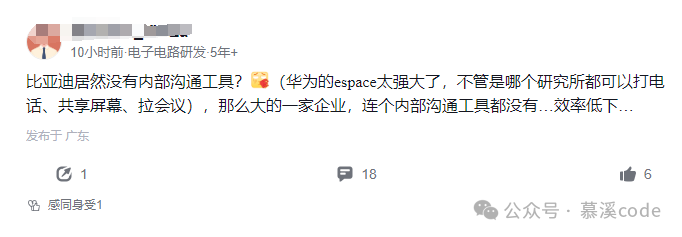 这位网友表示,像华为的espace这种内部沟通工具就很好用,不管哪个研究所都能打电话、共享屏幕、拉会议,反观比亚迪,这么大一家企业,居然连个内部沟通工具都没有,效率实在是太低下了。