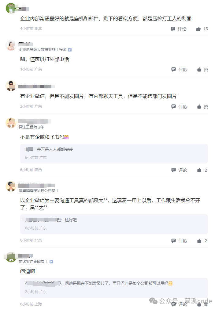 此言一出,立刻引发了网友们的热烈讨论。 有人表示感同身受,吐槽比亚迪内部沟通效率确实不高;也有人反驳说,比亚迪明明有企业微信和内部聊天工具,只是功能比较简陋,不能跨部门发图片。