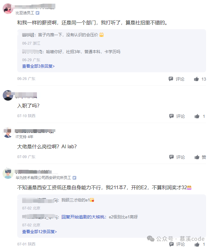 这位网友说自己是本科毕业,工作了8年,面试的是比亚迪第十五事业部,拿到了年薪40万的offer。本来是件值得恭喜的事儿,结果评论区却有人说,这个薪资在比亚迪的社招里算是不错的了。还有网友说,自己211本硕毕业,在华为西安研究所工作,级别是E2,不算利润奖才32万。