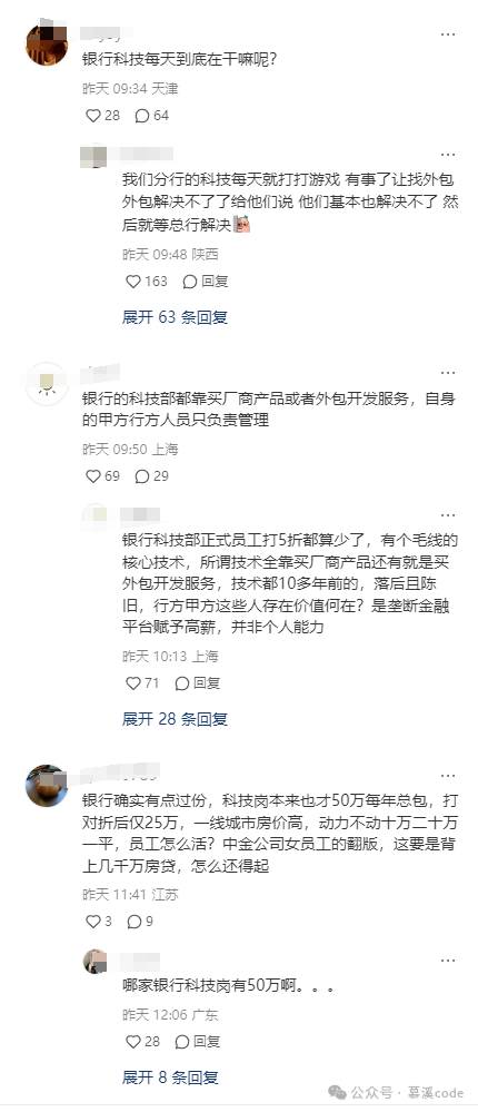 有网友发牢骚,“银行科技每天就打游戏,有事找外包”。银行科技部基本靠外包,自己的人只负责管理。有人说“银行科技部正式员工打5折都算少了”。有网友表示,科技岗年薪50万,打对折后仅25万,一线城市房价高,怎么活?