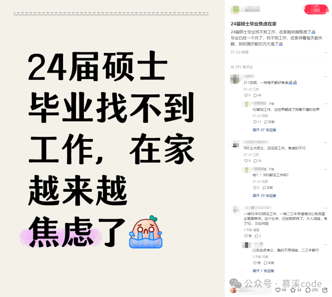 24届的硕士们毕业后面临的现实可真不乐观。一个网友说,自己是211农硕,每天焦虑到不行。另一位985土木硕士也没找到工作,焦虑得一塌糊涂。这些曾经被视为精英的高学历人才,竟然也在就业市场上碰壁。