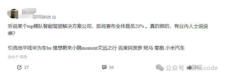 帖子一出,评论区瞬间炸锅。大家纷纷猜测到底是哪家大佬公司要裁员。有人提到华为车BU、理想、蔚来、小鹏,还有百度阿波罗、斑马、零跑、小米汽车等。这一看就是一个大牌云集的盛宴,谁家中枪都不会让人意外。