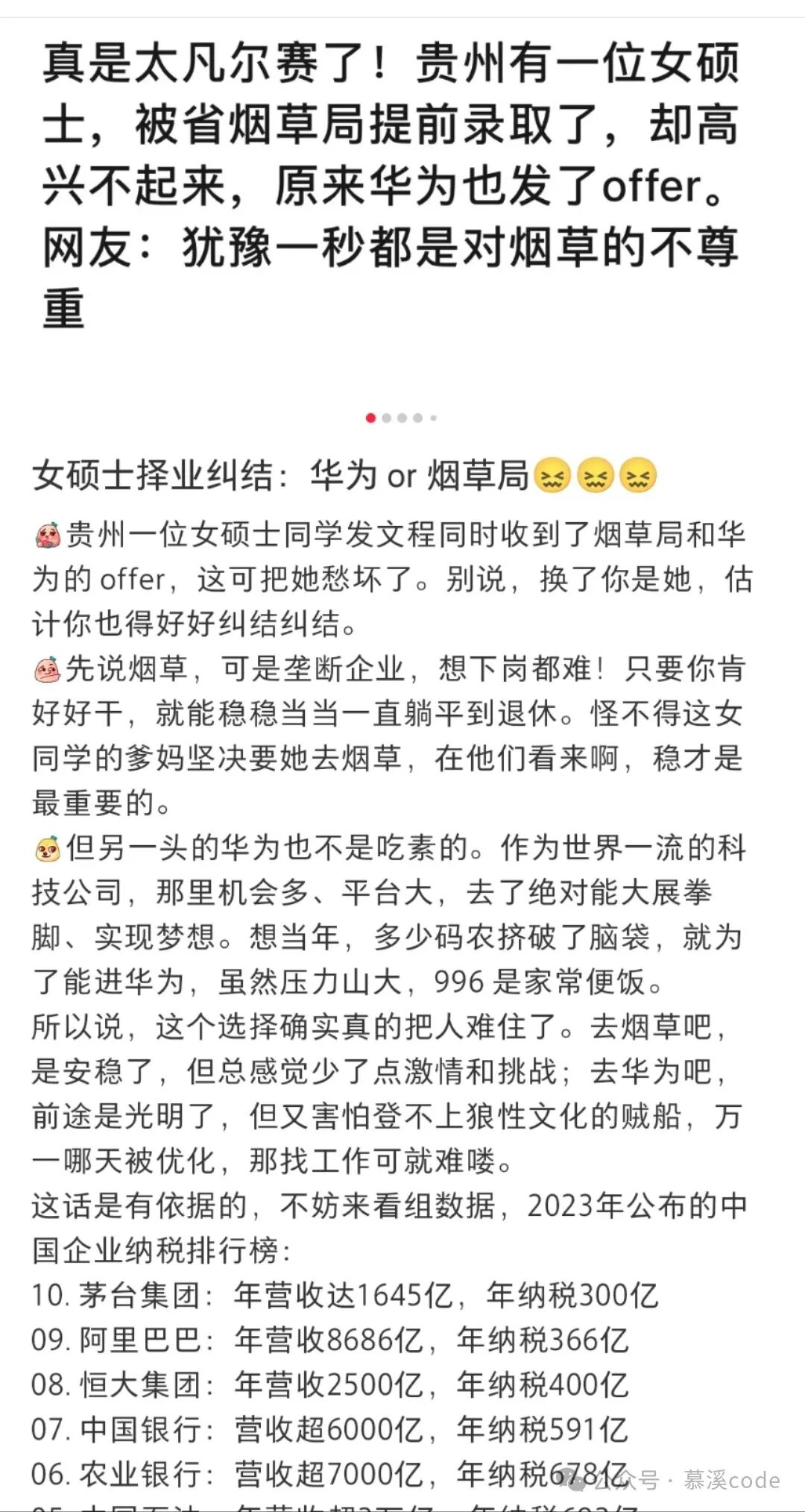 贵州一位女硕士同学同时收到了烟草局和华为的offer,这可真是愁坏了她。想想看,如果你是她,你会怎么选?