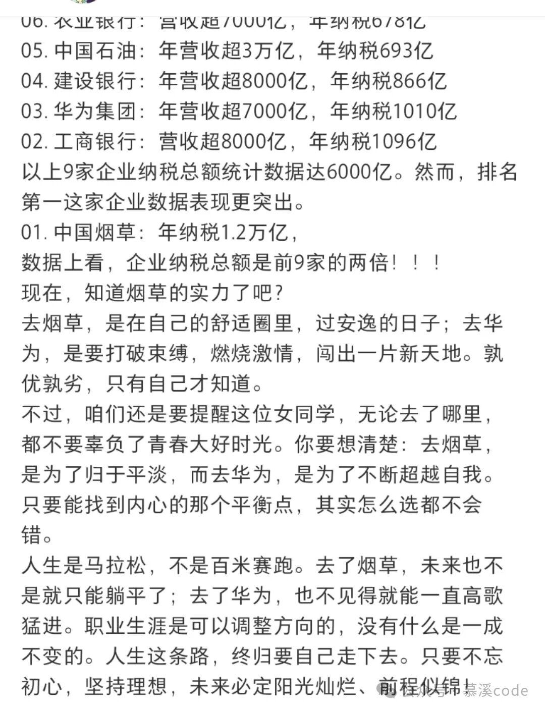 这位女硕士的选择确实难,但无论去了哪儿,都不要辜负青春大好时光。去烟草局,是为了归于平淡;去华为,是为了不断超越自我。找到内心的平衡点,怎么选都不会错。人生是马拉松,不是百米赛跑。去烟草局,不代表未来只能躺平;去华为,也不见得一直高歌猛进。职业生涯可以调整方向,没有什么是一成不变的。只要不忘初心,坚持理想,未来一定阳光灿烂、前程似锦!