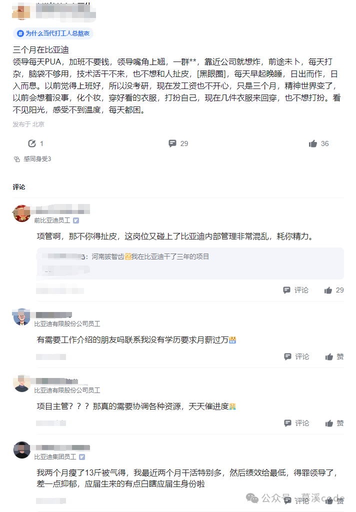 不少打工人总抱怨熬夜加班,这回在脉脉上比亚迪的项目管理岗又火了。一个员工吐槽,三个月在比亚迪,每天都在被领导PUA,加班没钱拿,领导还总是笑眯眯的,真是一群“妖魔鬼怪”。