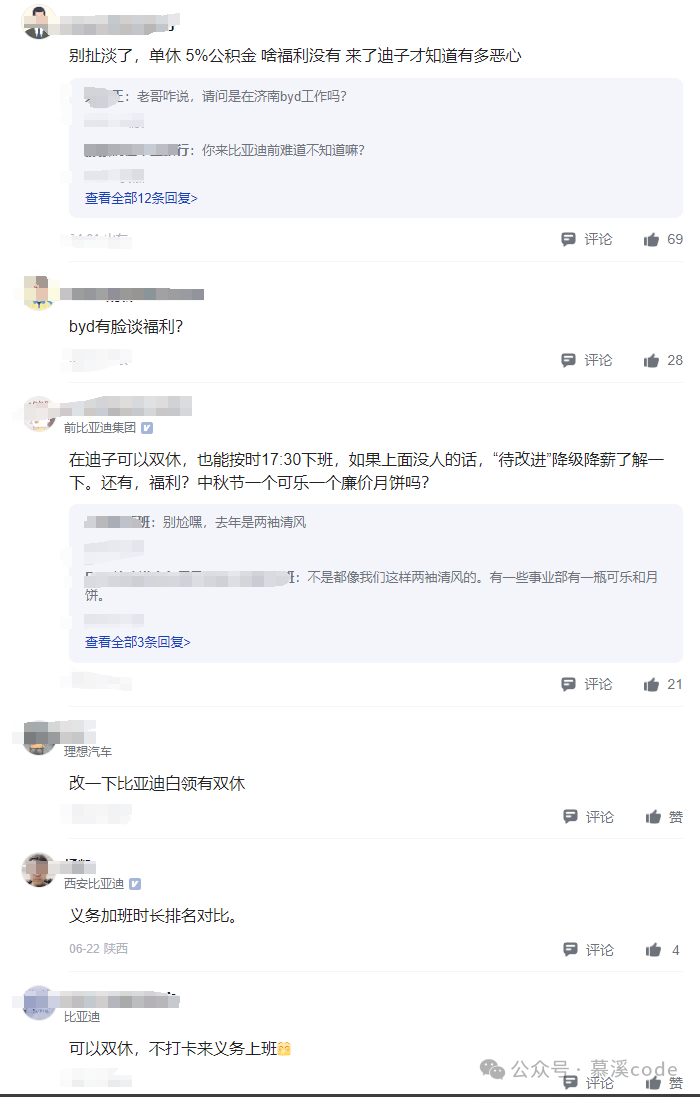 有人吐槽说,别的不说,比亚迪这福利待遇,在行业里那可是出了名的“抠门”,就给个5%的公积金,其他啥也没有,来了才知道啥叫“人间不值得”。还有位老哥,估计是在比亚迪“待改进”待出 PTSD 了,上来就开怼:双休?17:30下班?那是领导“看不见”你!一年四次考核,稍不留神就给你扣上“待改进”的帽子,降级降薪,比电视剧还刺激!