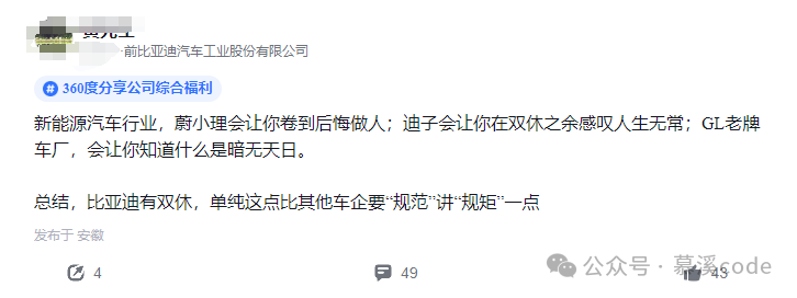 发帖的这位老哥,倒也没说啥 inflammatory 的话,就说比亚迪在车企里算“守规矩”的,好歹有个双休不是?这话一出,评论区立马炸开了锅。