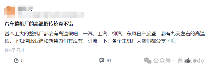 帖子中,这位网友提到,像一汽、上汽、柳汽、东风日产这些传统车企,基本上都有九天左右的高温假。可是,比亚迪和一些新势力车企,却似乎没有这个“传统”。