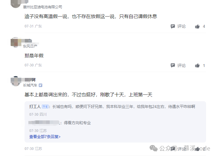 一位比亚迪的员工留言说,他们公司“没有高温假一说,也不存在放假这一说,只有自己请假休息”。另一位奇瑞的员工也表示,他们公司“只有战高温”。