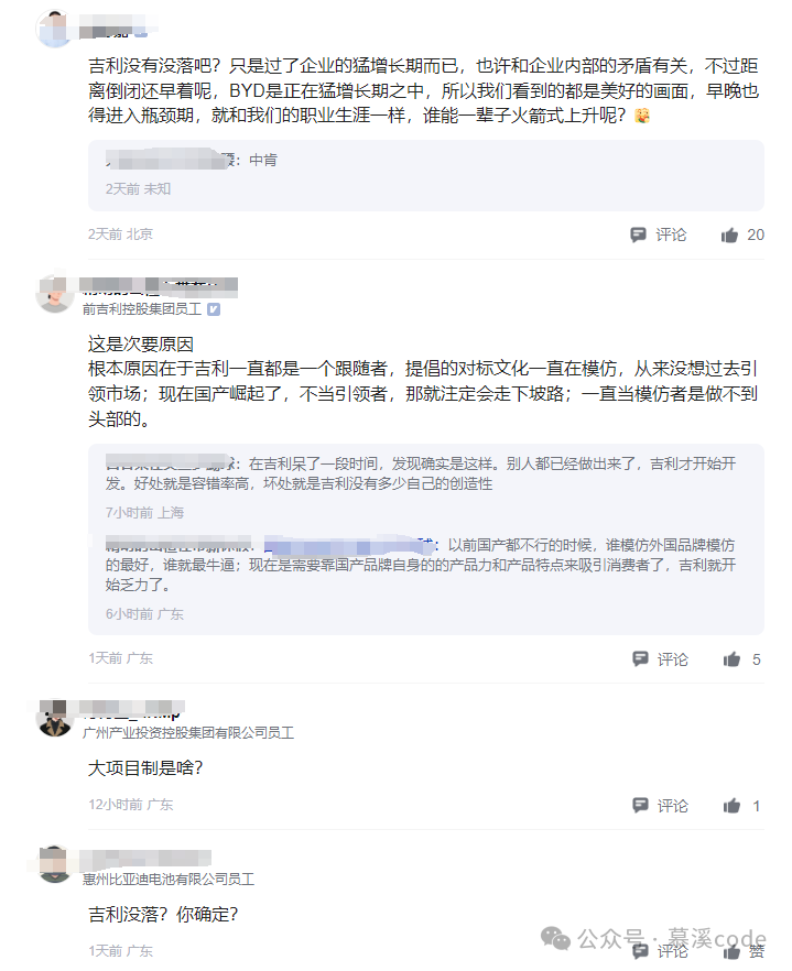 还有网友现身说法,说自己在吉利工作过一段时间,感觉吉利更像是一个“跟随者”,缺乏创新,总是跟在别人屁股后面跑。这话说得,真是有点扎心了老铁!