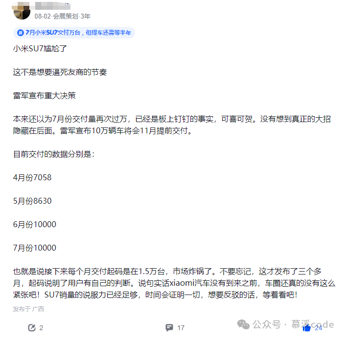 最近,脉脉上有个关于小米汽车交付的帖子火了,网友们可是议论纷纷,有人说小米这是要逼死友商的节奏,也有人觉得小米这是在吹牛皮,到底咋回事儿,咱今儿个就来唠唠。