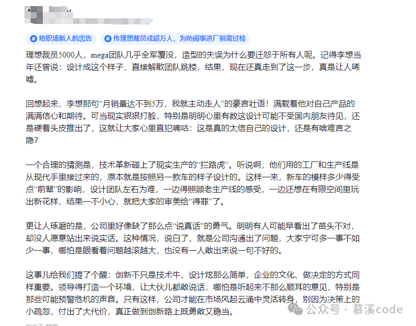 楼主不无唏嘘地回顾了理想汽车走过的路,裁员5000人,mega团队的悲剧,这不仅是因为设计上的失误,更归因于内部的沟通与决策失误。领导人的豪言壮语未兑现,与现实的差距反衍成了企业的一记重击。