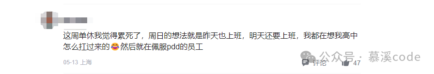 更有甚者,有人表示这周单休让人感觉累死了,几乎恶梦回到了那些为了考试一周七天都在学习的高中时光。工作中“双休变单休”的转变,体感上差距很大,不免让人回忆起学生时代的那份拼搏精神。而员工们在感叹自己如何撑过的同时,再次为pdd员工默默点上了一盏心疼的小灯。
