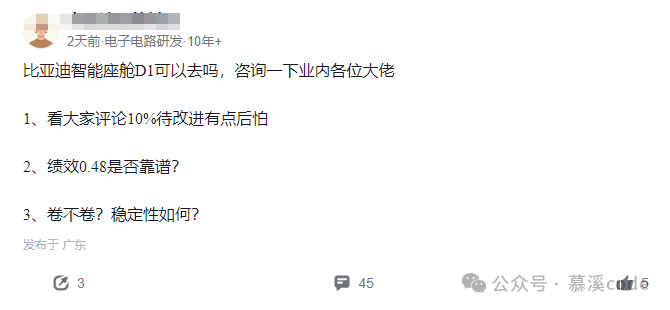 一位网友在脉脉上发帖,咨询关于比亚迪智能座舱D1岗位的情况,言语之间透露着一丝犹豫和迷茫。据说啊,比亚迪内部有个“10%待改进”的政策,简单来说就是每个季度末位淘汰10%的员工,这让不少网友感到担忧。