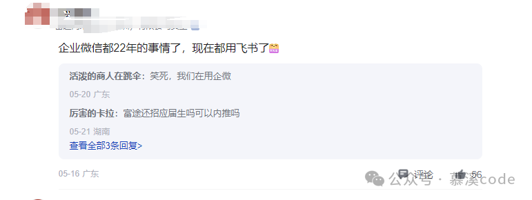 评论区内,观点相撞,见解分化。有网友“企业微信都22年的事情了,现在都用飞书了”透露着信息通讯工具的更迭,却也有立马回怼的声音:“笑死,我们在用企微。”琐碎的日常里,这些细节反映出企业文化和流行趋势的小小交织。