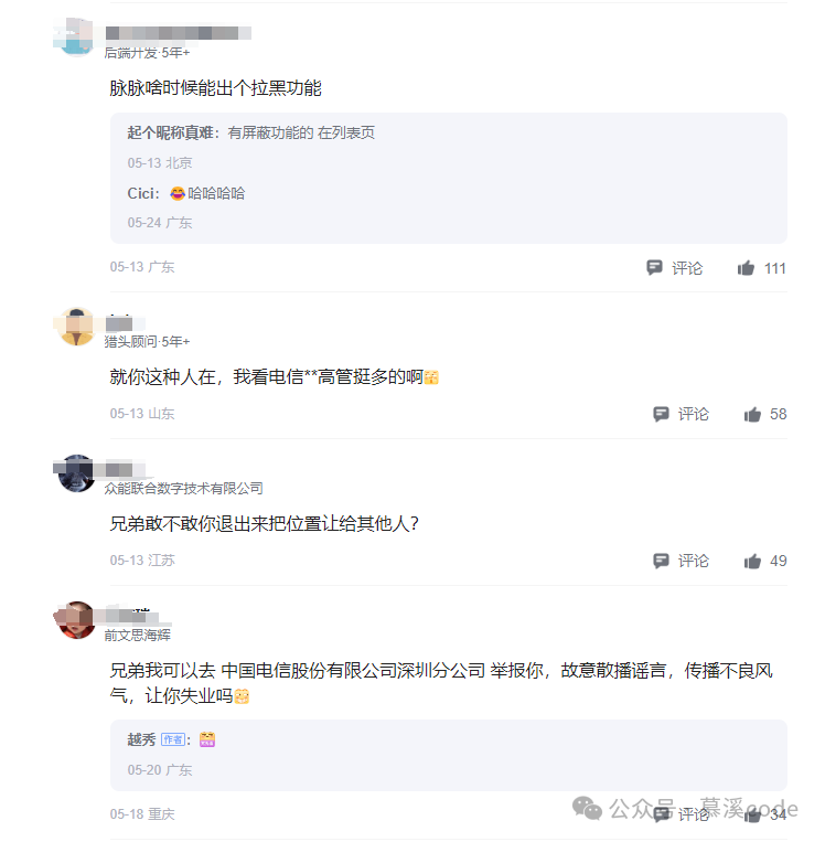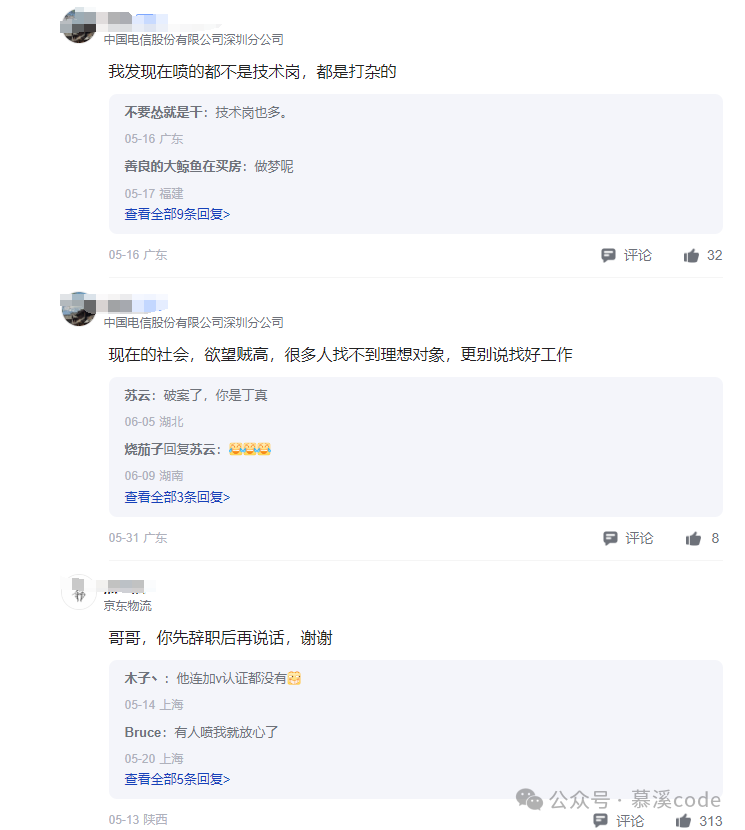 还有网友质疑:“你问问你同事 他们也没啥感觉”、“就你这种人在,我看电信高管挺多的啊”。