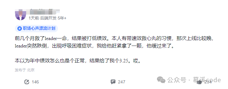 这位小哥在帖子中说,自己有随身携带速效救心丸的*惯,有一次leader突发疾病,多亏了他及时出手相救,才转危为安。本以为自己立了大功,怎么着绩效也得给个好评吧?结果没想到,最后只拿到了一个3.25的低分,这落差也太大了吧!