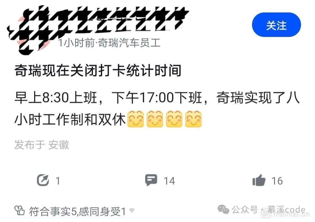 最近,奇瑞汽车在脉脉上引发了热议,不过这次的主角可不是什么新车型,而是一篇关于员工加班的帖子。帖子内容嘛,咱细细道来~