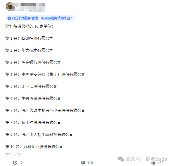 最近,一位自称是金融从业者的网友,在脉脉上发布了一份“深圳待遇最好的10家单位”榜单,引发了网友们的热议。不过,这份榜单的含金量究竟有多少,大家似乎并不买账。